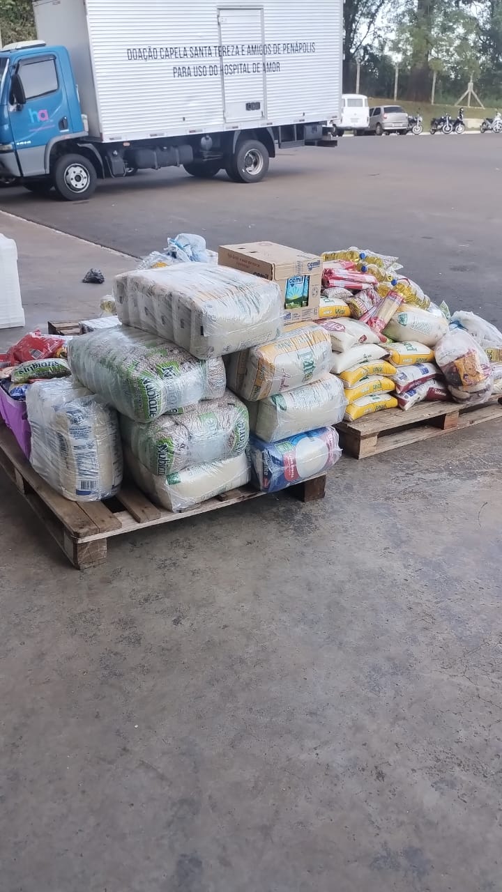 A instituição foi presenteada com 3 fardos de feijão, 10 fardos de arroz, 5 fardos de macarrão e 15 cestas básicas. Essa doação especial é de extrema importância para o HA.
