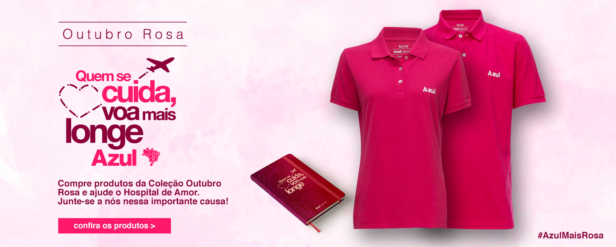 Apoiar a causa do “Outubro Rosa” é muito mais fácil com a Azul Collection. A linha de produtos inclui camisetas, chaveiros, copos, bloco de notas, meias e muito mais. Para adquirir os itens solidários, basta clicar no banner abaixo ou acessar o link: www.azulcollection.com.br/outubro-rosa.
