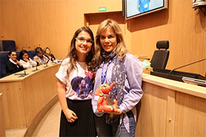 A idealizadora do “Evento Degustar”, Márcia Costa, recebe prêmio da paciente Larissa.