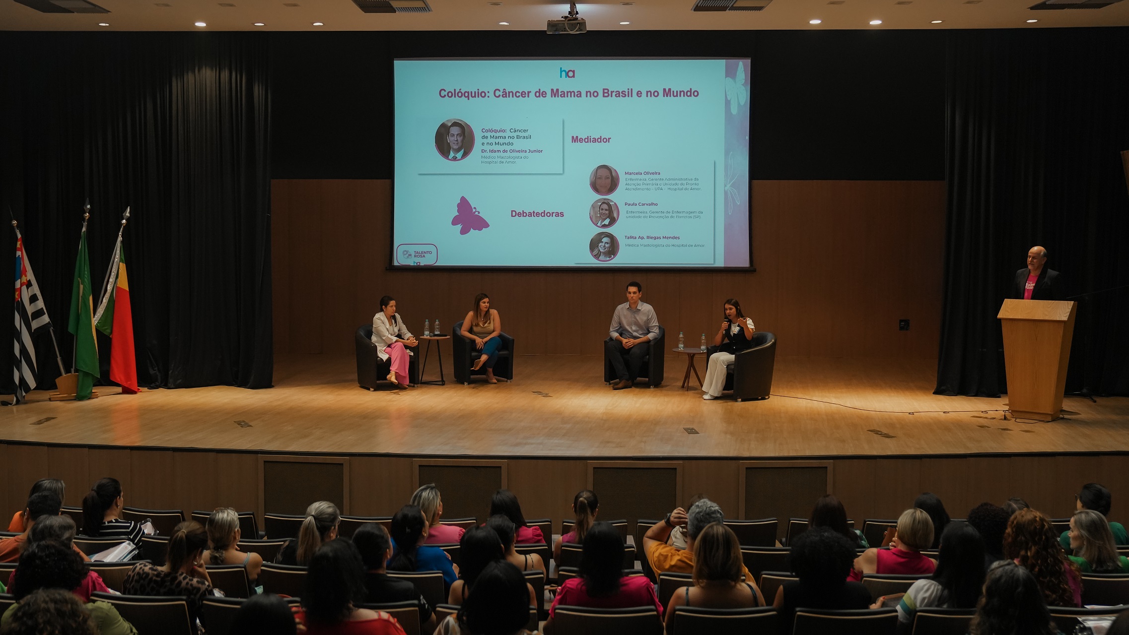 Câncer de Mama no Brasil e no Mundo – com os mastologistas do HA, Dr. Idam de Olivera Jr. e Dra. Talita Mendes; com a gerente administrativa da atenção primária e unidade de pronto atendimento (UPA) do HA, Marcela de Oliveira Santos; e com a gerente do Instituto de Prevenção do HA, Paula Carvalho Ribeiro.